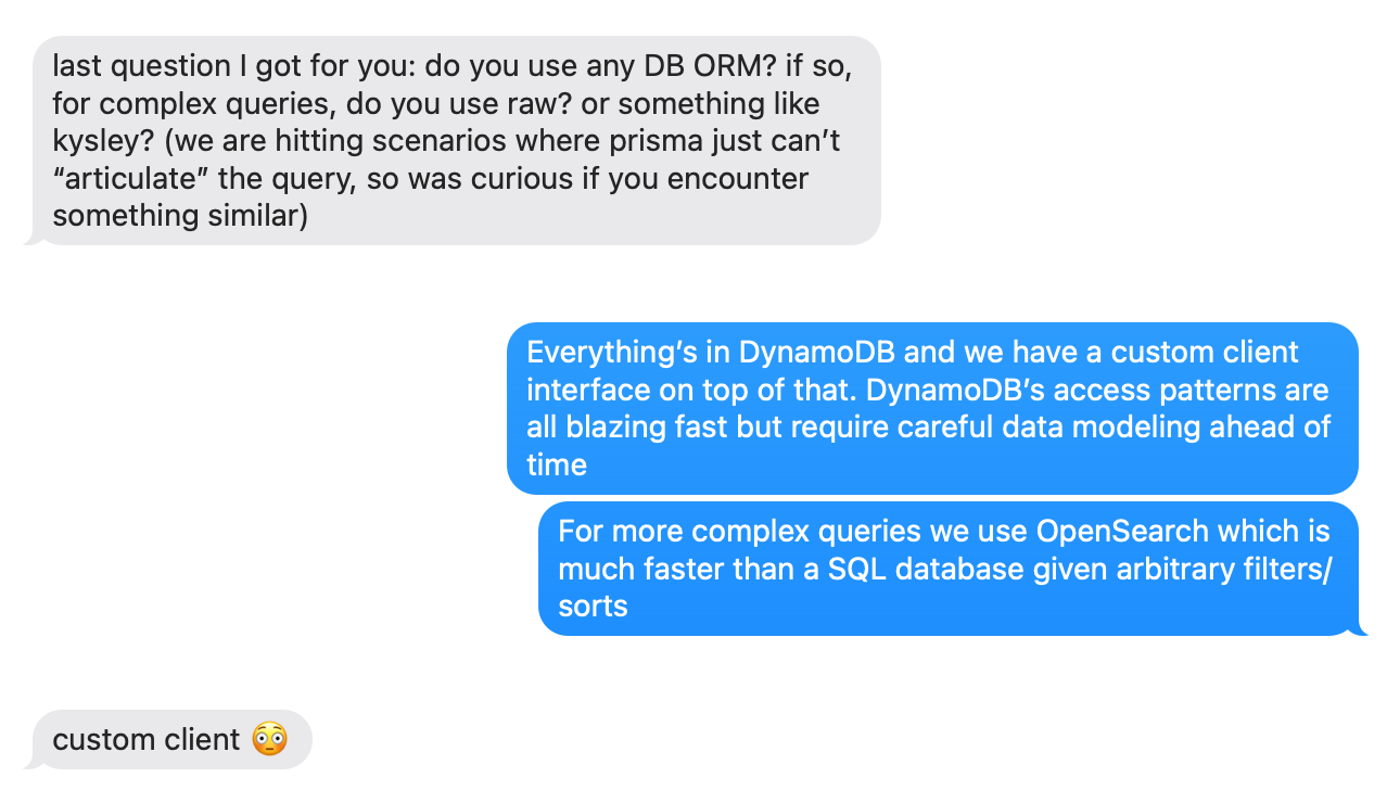 The two main databases we use at Alpine are DynamoDB and OpenSearch (a fork of ElasticSearch). We have our own clients for both. And also for Cloudflare R2, AWS SES, and AWS SQS.